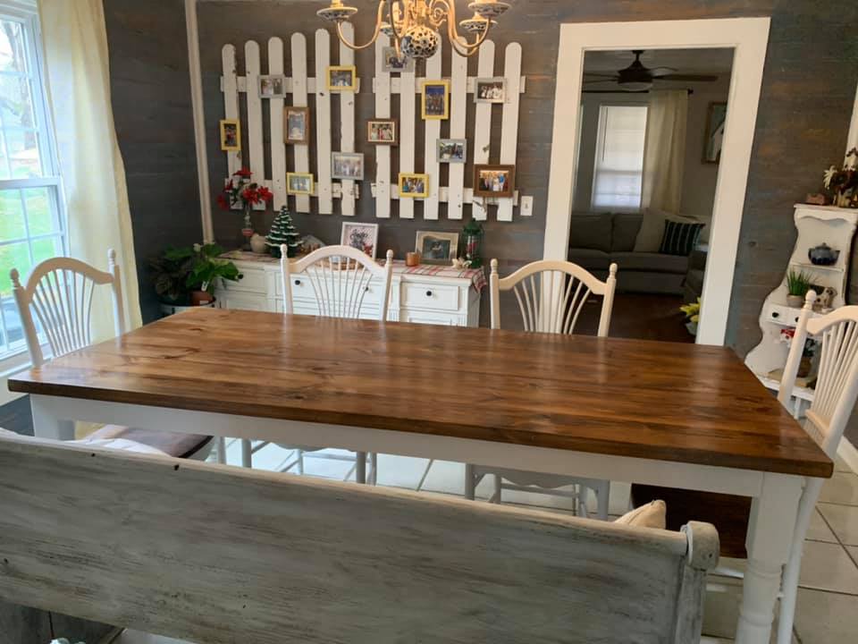 Some of you have noticed that we have been working on a new table for our new house. It’s the biggest project I’ve done in a while. If you don’t know, our process looks like me building something, and then Cassie finishes it. (stain, paint, sealer, etc.) She’s the mastermind (of course!) and it was her idea to use reclaimed porch posts as legs. And it is finished.