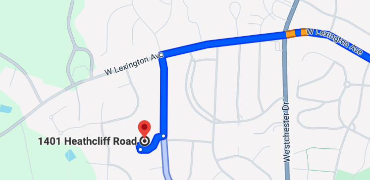 Our church is located at 1401 Heathcliff Road. From North Main Street, turn South onto W. Lexington Avenue. After 1.4 miles, turn left onto Heathcliff Road. From Westchester Drive, turn South onto W. Lexington Avenue. After .4 miles, turn left onto Heathcliff Road.